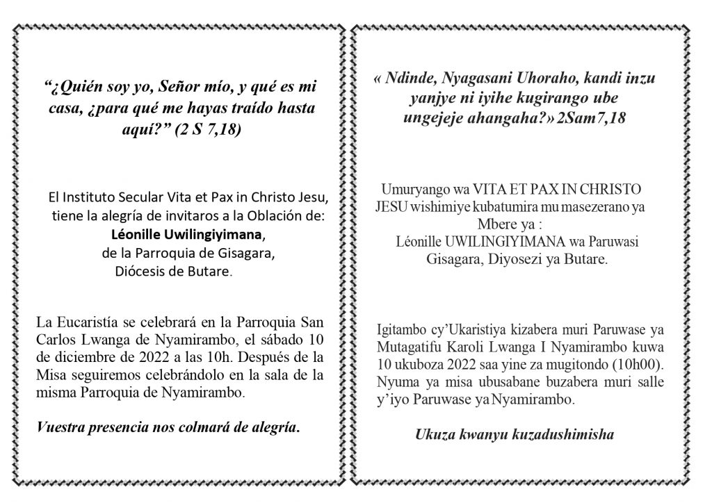 Celebración de la Primera Oblación de Leonille Leonille Uwilingiyimana, desde las tierras africanas, en...